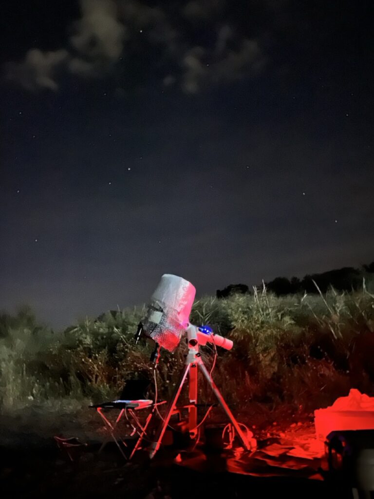 秋田谷も伊達市近郊の海沿いの地点に望遠鏡を持ち込み観測に臨みました(写真1)。夜半前には望遠鏡を天体に向けて準備を整えましたが、晴れ間が多いものの、ときどき大きな雲が横切る不安な空模様でした。結局、薄雲がかかったためか、カメラに映る天体の姿が淡くなり、減光の有無を確認するのが難しいデータとなってしまいました。他の観測地点の観測者も天体の暗さと雲の通過に悩まされ、画像の解析に苦労しているようです。一方で、場所によっては明確な減光を捉えたという報告も出ています。これから慎重なデータ解析にを経て、観測キャンペーン全体の最終結果がとりまとめられる見込みです。